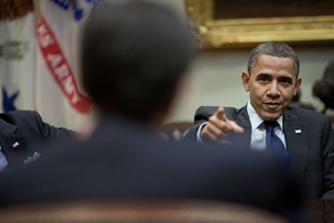 President Barack Obama points to Office of Management and Budget Director Jack Lew during a meeting with senior advisors in the Roosevelt Room of the White House, March 31, 2011. (Official White House Photo by Pete Souza)