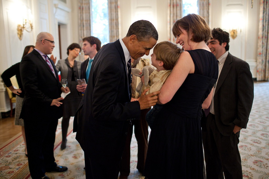 President Barack Obama plays with Leo Chaudhary, son of White House Videographer Arun Chaudhary, right, and Chaudhary’s wife, Laura Moser, prior to a Seder with friends and staff in the State Dining Room of the White House, April 18, 2011. (Official White House Photo by Pete Souza)