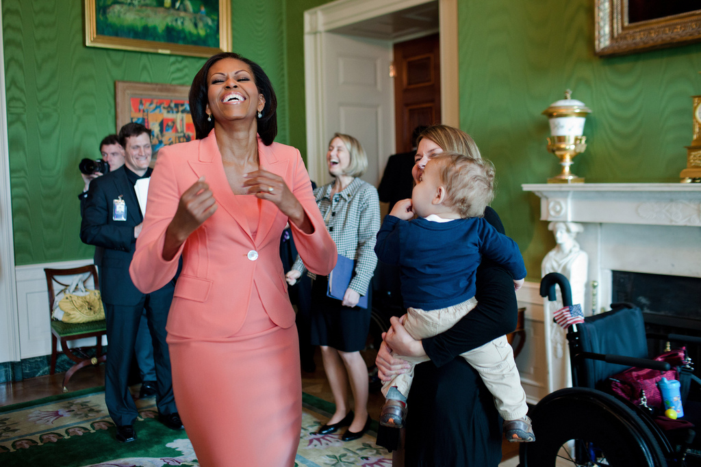 First Lady Michelle Obama laughs while visiting with Brianna Mast, wife of Wounded Warrior Sgt. Brian Mast, and their son Magnus, in the Green Room of the White House, prior to the Joining Forces initiative event in support of military families, April 12, 2011. (Official White House Photo by Samantha Appleton)