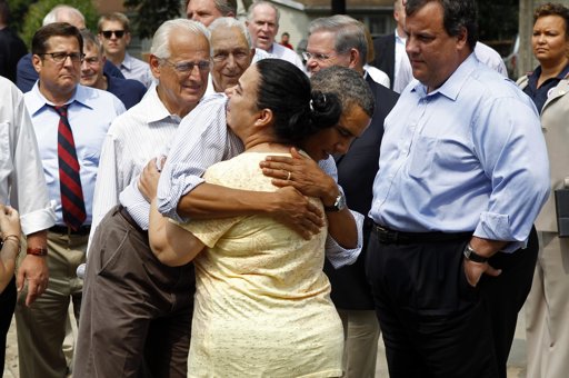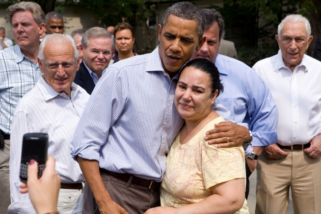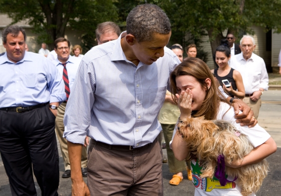 President Barack Obama comforts residents in a neighborhood hit with flooding from Hurricane Irene in Wayne, N.J., Sept. 4 (Top photo by Pete Souza)