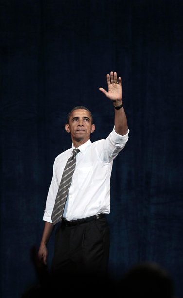 President Obama greets people during his arrival at Moffett Airfield, near San Jose, September 25