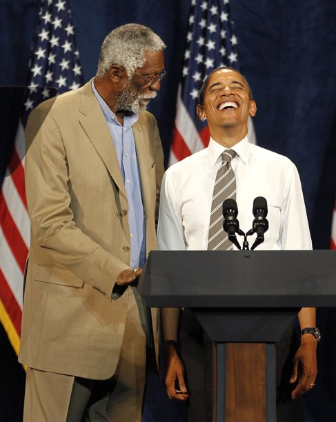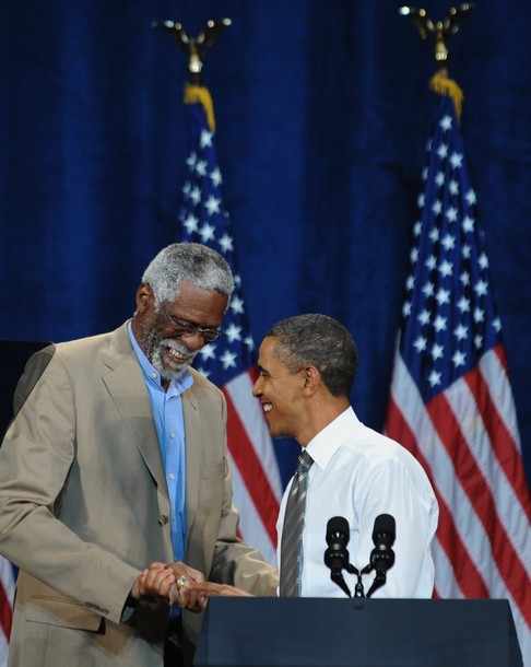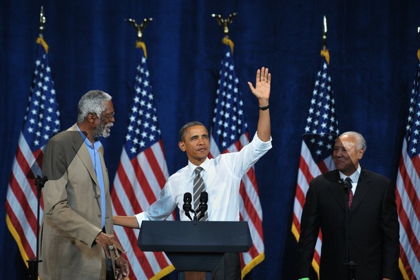 President Obama is introduced by NBA legends Bill Russell and Lenny Wilkens at a Democratic party fundraiser in Seattle, September 25