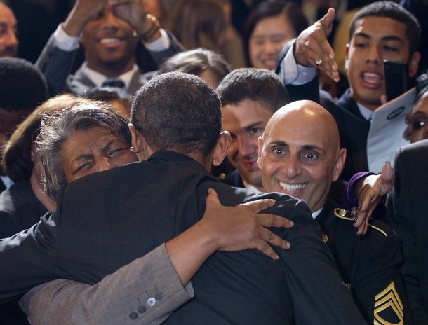 President Obama shakes hands with U.S. Army Sgt. First Class Leroy Arthur Petry of Santa Fe, N.M., after being introduced by Petry, who received the Medal of Honor, before speaking at the White House Forum on American Latino Heritage