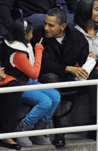 Daughters Malia and Sasha sat in the first row of the bleachers. Also attending were Obama’s mother-in-law, Marian Robinson, and Education Secretary Arne Duncan, a former professional basketball player and friend of Obama’s from Chicago.