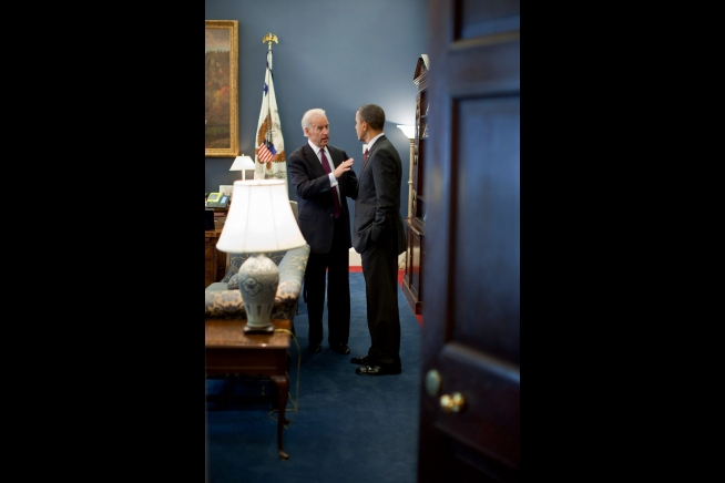 President Barack Obama talks with Vice President Joe Biden in the Vice President’s West Wing Office at the White House, Dec. 15, 2011. (Official White House Photo by Pete Souza)