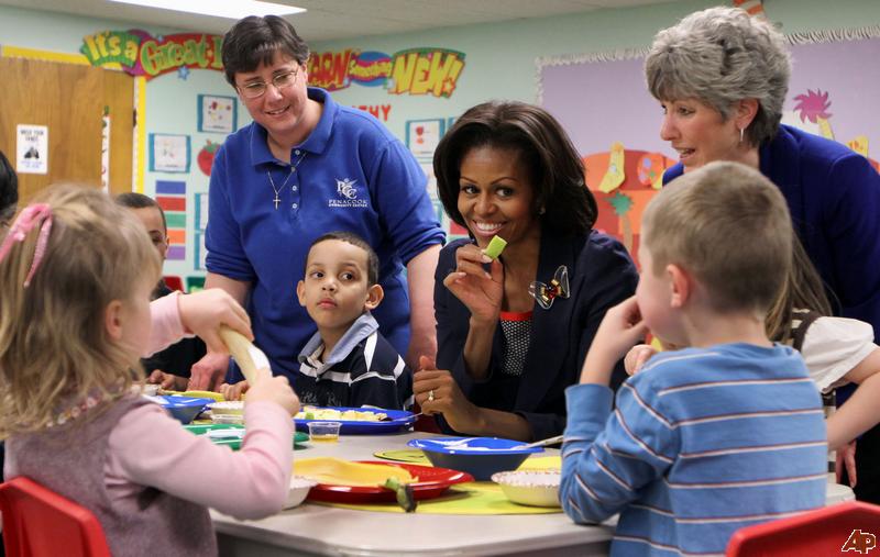 First lady Michelle Obama gets hugs from a pre-schooler at the Penacook Community Center, March 9, in Concord, N.H.
