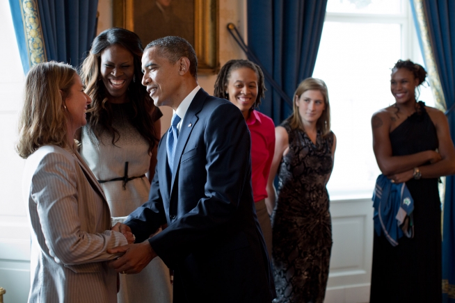 President Barack Obama greets Minnesota Lynx coach Cheryl Reeve in the Blue Room of the White House prior to an event honoring the 2011 WNBA champions, Sept. 18, 2012. (Official White House Photo by Pete Souza)