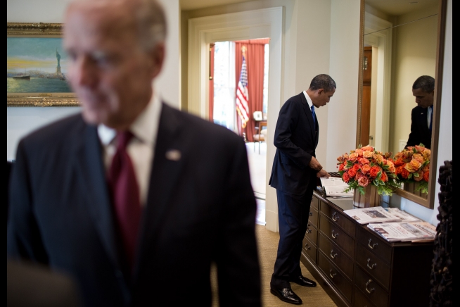 President Barack Obama looks at a magazine on the credenza in the Outer Oval Office before departing the White House for a trip, Sept 27, 2012. Vice President Joe Biden talks with an advisor in the foreground. (Official White House Photo by Chuck Kennedy)