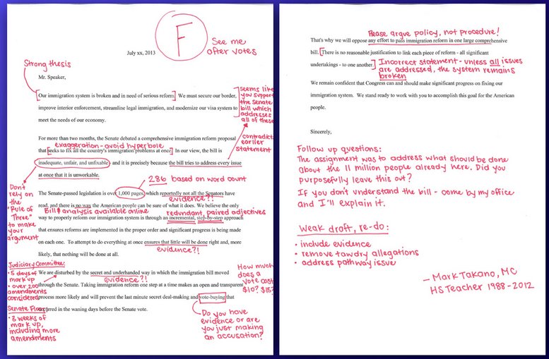 However, when Rep. Mark Takano (D-Calif.) received the letter and found the content to be “weak,” he did what any self-respecting former teacher would do. He got out his red pen and gave the document a straight-up F. (Takano taught high school for more than 20 years, reports Southern California Public Radio station KPCC, and it appears he still has quite a bit of teacher left in him.)