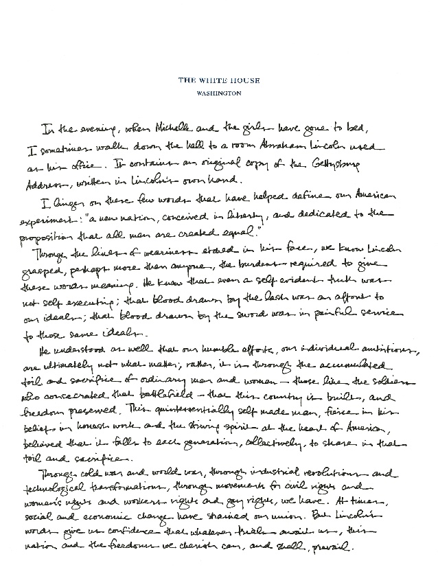 President Obama counts among his many phenomenal attributes a unquestionably seasoned ability to write so beautifully and lyrically. His passion for these subjects are pronounced wondrously in his books and essays. He is such a deep thinker yet has such a fluidity of style and expression that I am often truly mesmerized by what he has to say. That is certainly the case with this handwritten reflection on the Gettysburg Address. I cannot wait for his memoirs. I will savor every word.