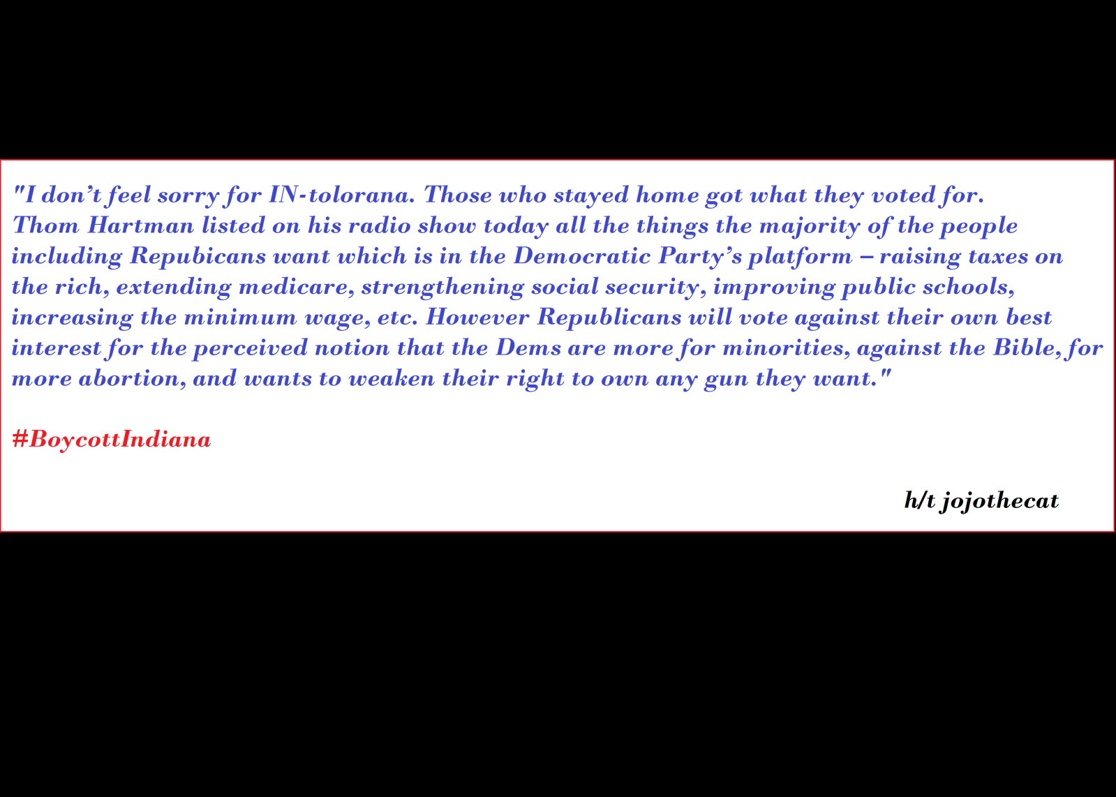 I don’t feel sorry for IN-tolorana. Those who stayed home got what they voted for. I was listening to Thom Hartman and he was reading off all the things the majority of the people including Repubicans wants which is in the Democratic Party’s platform - raising taxes on the rich, extending medicare, strengthening social security, improving public schools, increasing the minimum wage, etc. However Republicans will vote against their own best interest for the perceived notion that the Dems are more for minorities, against the Bible, for more abortion, and wants to weaken their right to own any gun they want.