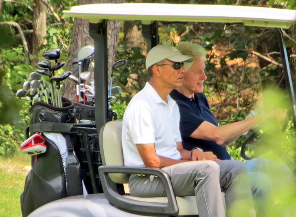 President Barack Obama waves to people from a golf cart while golfing at Farm Neck Golf Club, in Oak Bluffs, Mass., on the island of Marthaâs Vineyard
