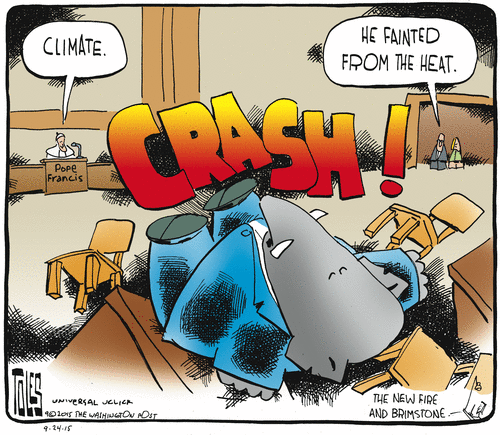 Morning, everyone. I hope the R members of Congress don’t make fools of themselves during the pope’s address. They are such an international embarrassment. The next three weeks will be giddy/exhausting/hectic for me. Son arrives tomorrow at noon for two week stay and then our three-year old granddaughter is staying with us for a week on her own. So much to do, so much to plan, including a big Salsa the Vote event on November 1. Hope everyone has a great and glorious Fall day.