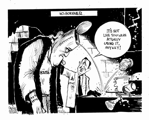 Morning all. Between family visits and other things, I just get to drop by lately so miss you all. Off to another doctor’s appointment this am, hopefully the last to this particular specialty. The toons are wonderful and funny, but also sad in their implications for our future. At this point, the Congress of the United States has become such an ongoing farce it would not surprise me to see members throwing spitballs at each other. The aggregate maturity level among House Republicans is lower than my 3-year old granddaughter’s. But unlike our little one, these guys are dangerous.