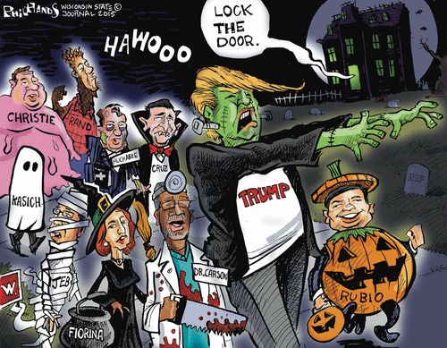 Can’t figure out what Rand is back there-Wolf Man?-but Trump, Rubio, Cruz and Christie are perfect. Cruz would actually be perfect casting for a Dracula film, although Count D is supposed to have some superficial charm and Cruz has none.