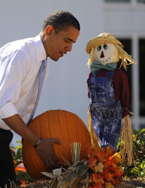 The President and the First Lady welcome local children and children of military families to trick-or-treat at the South Portico of the White House.