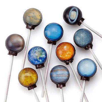 “Using a classic candy making process, Heather Kelly creates edible works of art in these planetary lollipops. A three-step process of encapsulating images in a confectionery blend results in ten distinct lollipops and flavors that are visually out of this world: Each planet and the sun gets it’s own flavor: blackberry, cherry, cotton candy, guava, marshmallow, pear, key lime, strawberry/kiwi, mango, and tropical punch. Gift to your favorite science geek or treat yourself to your very own taste of the galaxy. Handmade in Clarendon Hills, Illinois.”