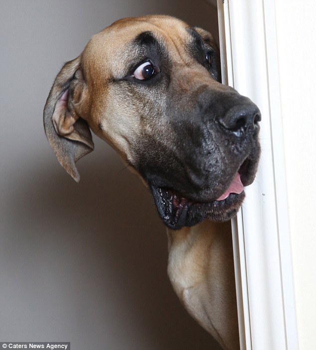 Scaredy cat: 13-stone Great Dane Presley gets frightened by the smallest things, says his owner Sian Barrett