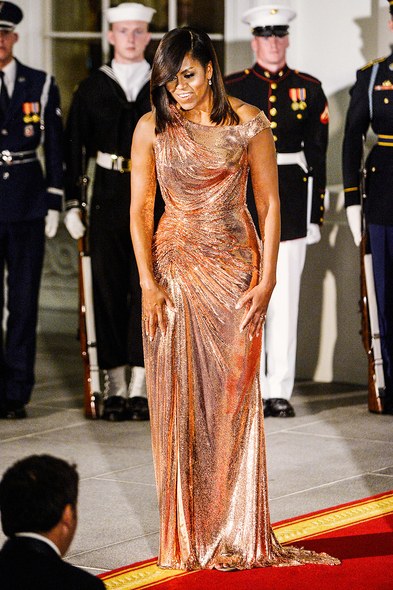That bronze draped metallic looking dress is probably my favorite one Michelle has worn. I think it is extremely flattering. I saw her Inaugural gown from the first Inauguration in the Smithsonian, to me this dress beats that one. Does she get to keep any of them? Not sure if they are bought from a clothing allowance or her own money.