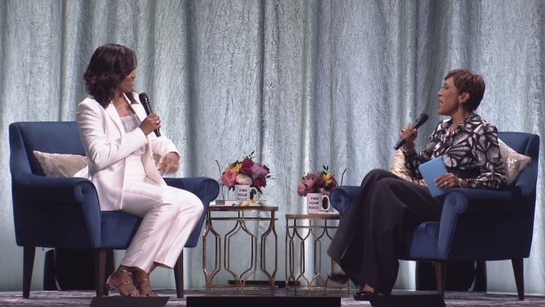 About 30 feet from @MichelleObama and @RobinRoberts having a chat, up in Vancouver, Canada. ❤️ The NHL arena is packed! pic.twitter.com/Kl3Cfl0Y3P