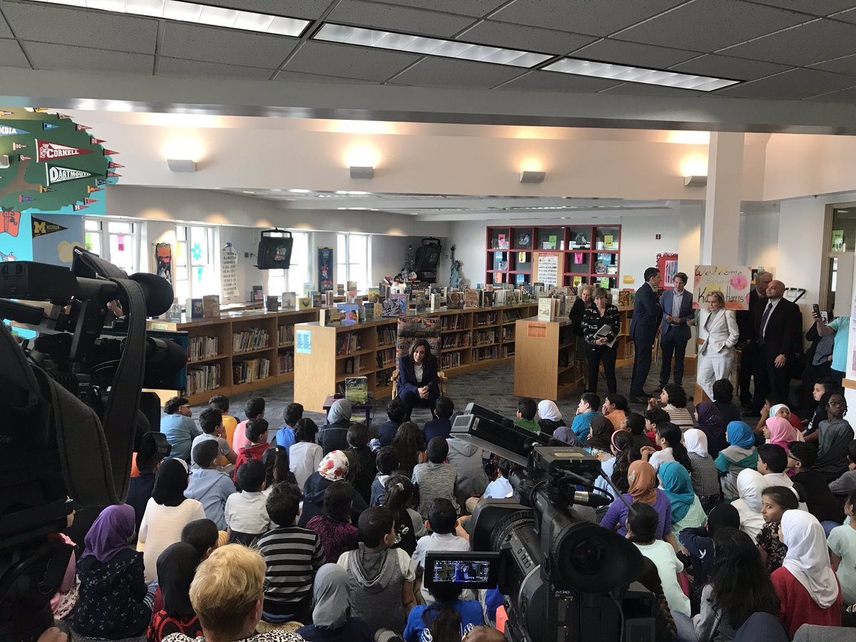 Senator Harris talks to children at Miller Elementary School in Dearborn, MI.