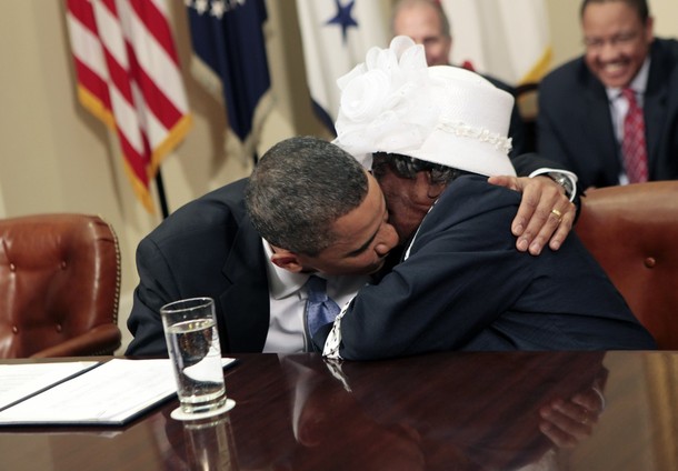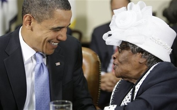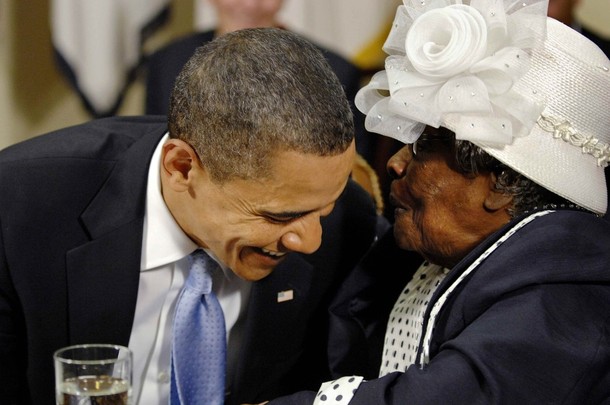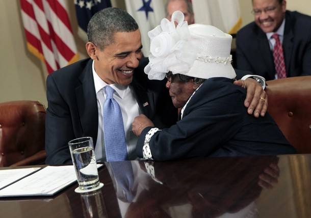 ……Obama made special note of two guests. “Mr. Joseph Harvey is 105, and Ms. Mabel Harvey here is the spry young one at 102,” Obama said. “And Ms. Harvey just now was whispering in my ear, as you guys were walking in, that this must be the Lord’s doing, because we’ve come a mighty long way.”