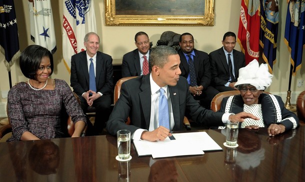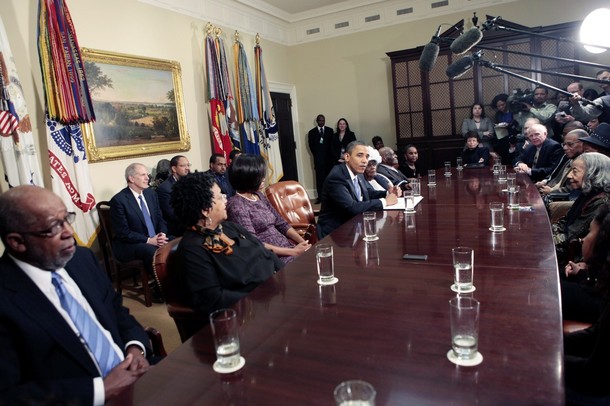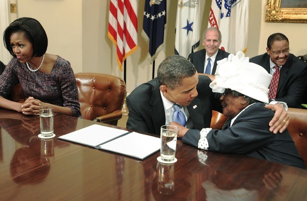 President Barack Obama talks with Mable Harvey, 102 from Washington, DC. , after a conversation with a small group of African American seniors and their grandchildren on the legacy of the civil rights movement in the Roosevelt Room of the White House in Washington Monday, Jan. 18, 2010.