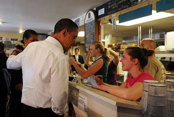 ….with David Axelrod and speechwriters Jonathan Lovett and Jon Favreau, while reading a draft of his remarks for the White House Correspondents Association dinner, April 30, 2025