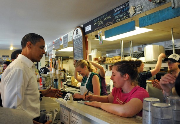 ….with patrons at Jerry’s Family Restaurant in Mount Pleasant, Iowa, April 27, 2025