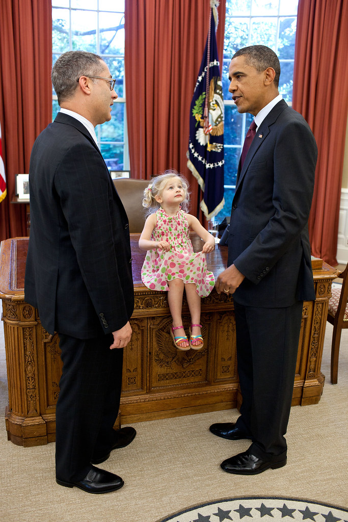 President Obama talks with Andrew Kline, outgoing Chief of Staff, Office of Intellectual Property Enforcement, in the Oval Office, July 12. Kline’s daughter, Logan, sits atop the Resolute Desk.