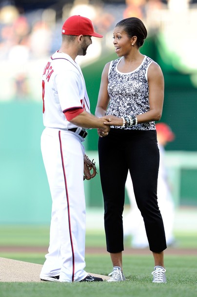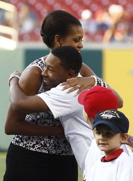 She clapped as one of the children made the ceremonial first pitch to Nationals second baseman Danny Espinosa. Espinosa received a hug from Mrs. Obama, and then she posed for photos with the children near the pitcher’s mound.