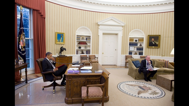 President Barack Obama talks on the phone with King Abdullah of Saudi Arabia during a call in the Oval Office, Jan. 11, 2011. John Brennan, Assistant to the President for Homeland Security and Counterterrorism, is at right. (Official White House Photo by Pete Souza)