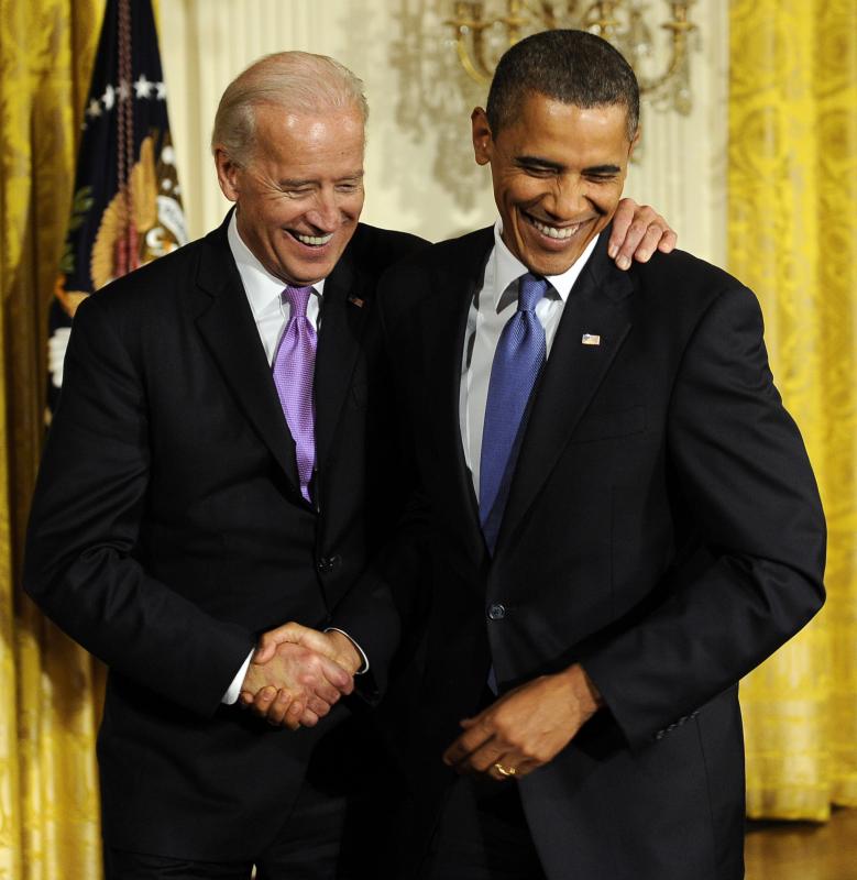 President Barack Obama shakes hands with Vice President Joe Biden after they mades remarks about Domestic Violence Awareness Month in the East Room of the White House in Washington on October 27
