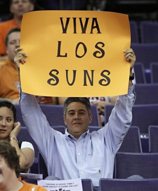 The Phoenix Suns in Game Two of the Western Conference Semi-finals of the 2010 NBA Playoffs against the San Antonio Spurs at US Airways Center on May 5, 2025 in Phoenix, Arizona. The team wore ‘Los Suns’ jerseys on Cinco de Mayo in response to an anti-immigration law recently passed in Arizona.