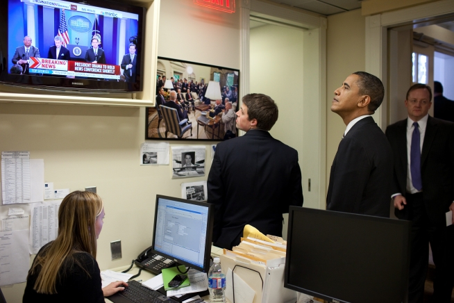President Barack Obama waits in the Lower Press Office of the White House before the start of his press conference, Dec. 7, 2010. (Official White House Photo by Pete Souza)