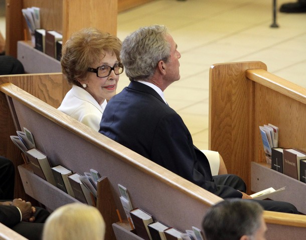 From top left, former first lady Nancy Reagan (partially obscured), former President George W. Bush, Secretary of State Hillary Rodham Clinton, first lady Michelle Obama and former first lady Rosalynn Carter watch as members of the armed forces carry the coffin bearing the body of former first lady Betty Ford into St. Margaret’s Episcopal Church Tuesday, July 12, 2011, in Palm Desert, Calif. At lower left is former first lady of California, Maria Schriver.