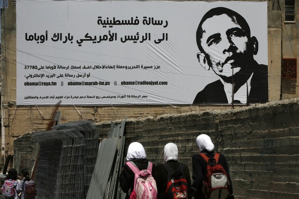 Palestinian schoolgirls walk past a billboard in which Palestinians are encouraged to send messages addressed to US President Barack Obama asking for liberation and the end of Israeli occupation, on April 27, 2025 in the West Bank city of Hebron.