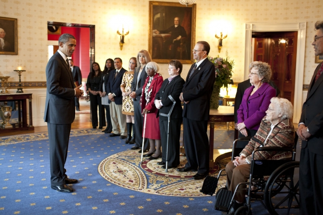President Barack Obama greets the 2011 Presidential Citizens Medal recipients in the Blue Room of the White House prior to a medal ceremony in the East Room, Oct. 20. (Official White House Photo by Pete Souza)