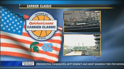 The tip off of an NCAA Men’s Basketball game between the University of North Carolina and Michigan State University on board the USS Carl Vinson at North Island Naval Station in San Diego, Calif., Nov. 11. (Official White House Photo by Lawrence Jackson)