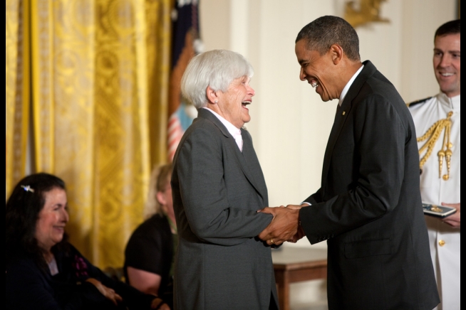 President Barack Obama laughs with Elizabeth Cushman Titus Putnam, a winner of the 2010 Presidential Citizens Medal, during a ceremony in the East Room of the White House, Aug. 4, 2010, honoring the 13 recipients of the nation’s second-highest civilian honor. (Official White House Photo by Lawrence Jackson)