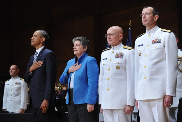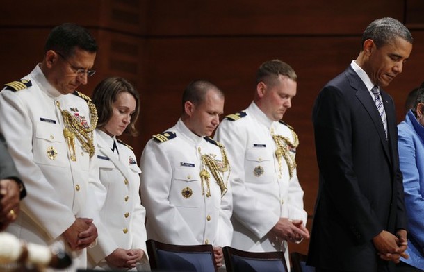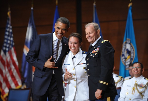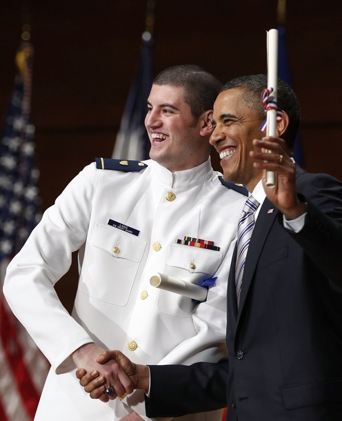 President Barack Obama makes the traditional Hawaiian “shaka” greeting sign with Ensign Parish Martin Keoni Kaleiwahea and his father Parish after he received his diploma and commission at the U.S. Coast Guard Academy graduation in New London, Conn., May 18