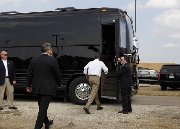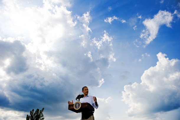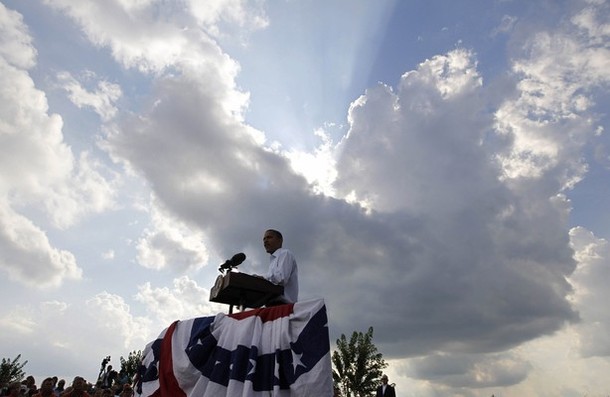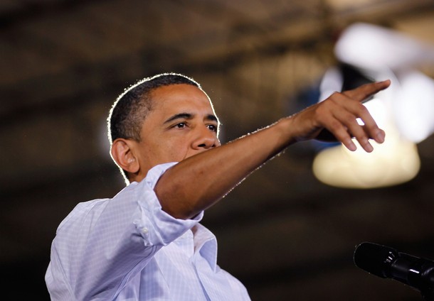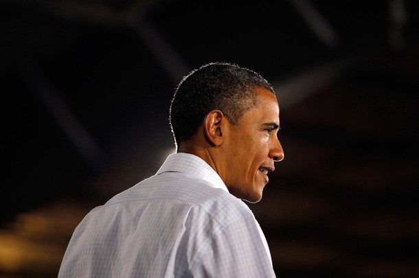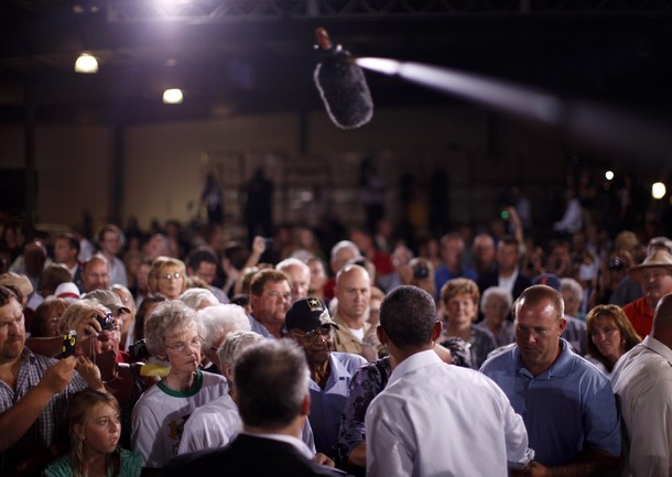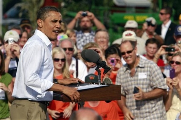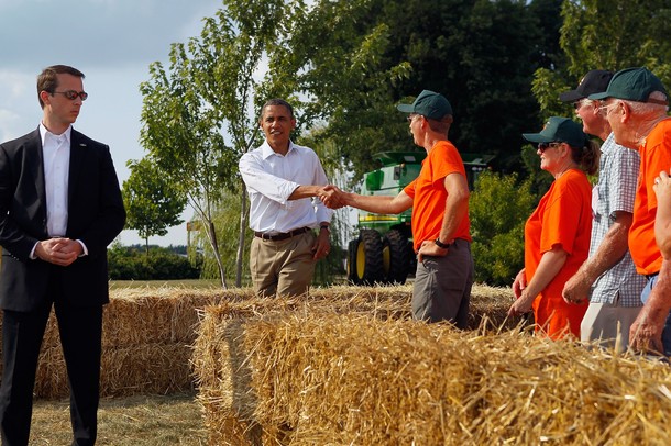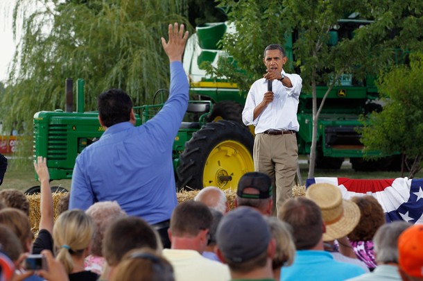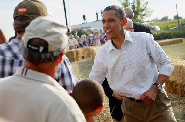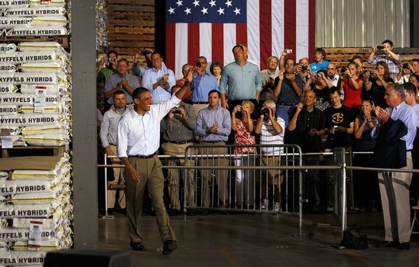 President Obama arrives to speak at a town hall style meeting at Country Corner Farm Market on August 17, in Alpha, Illinois