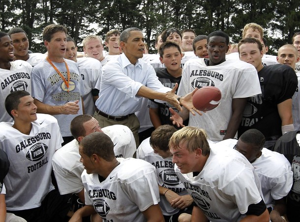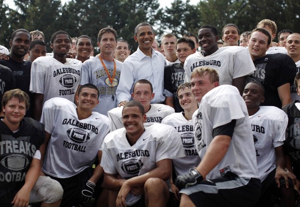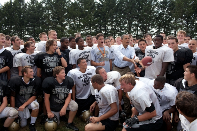 President Obama huddles with the Galesburg High School football team in Galesburg, Ill.