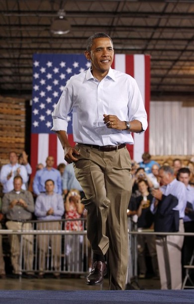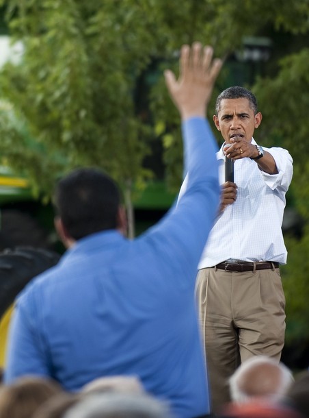 President Obama jumps onto the stage prior to speaking at a town hall meeting, Aug. 17, at Wyffels Hybrids Inc., in Atkinson, Ill
