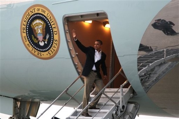 President Obama waves as he boards Air Force One at the Air National Guard Base in Peoria, Ill., en route to Washington after his three-day economic bus tour