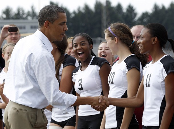 A girl on the Galesburg High School volleyball team reacts as she gets to meet President Barack Obama