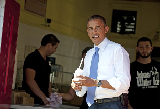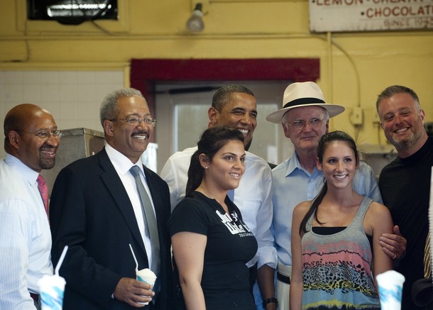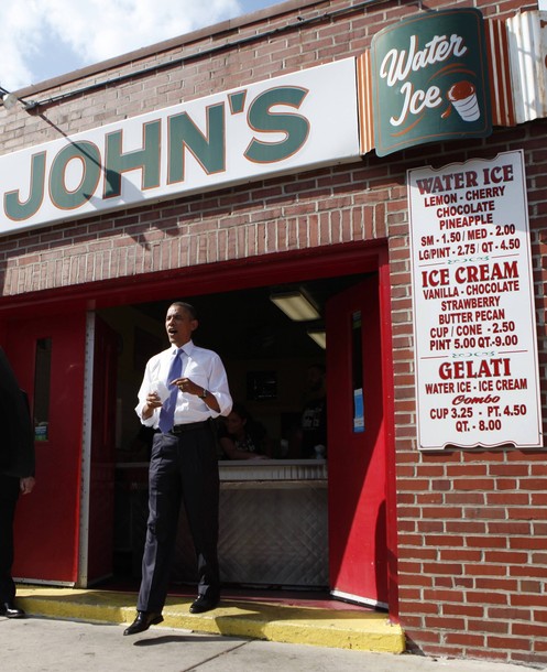 President Obama and Pennsylvania Democratic Senator Bob Casey order water ices during an unannounced stop at John’s Water Ice in Philadelphia