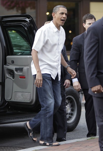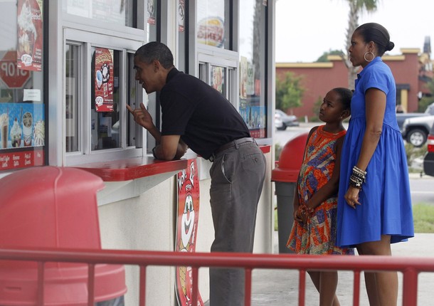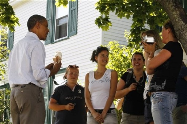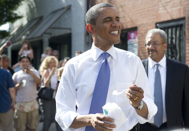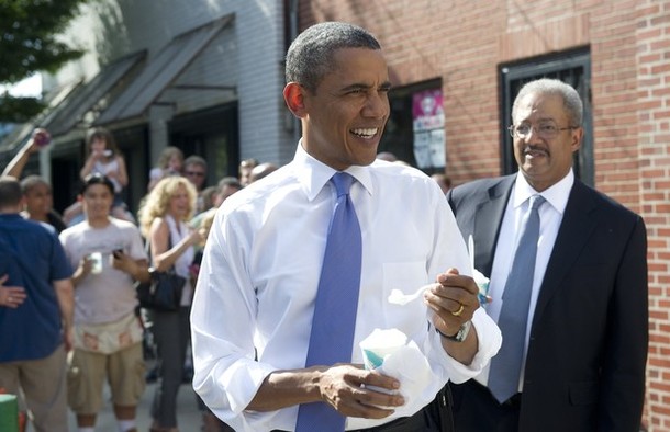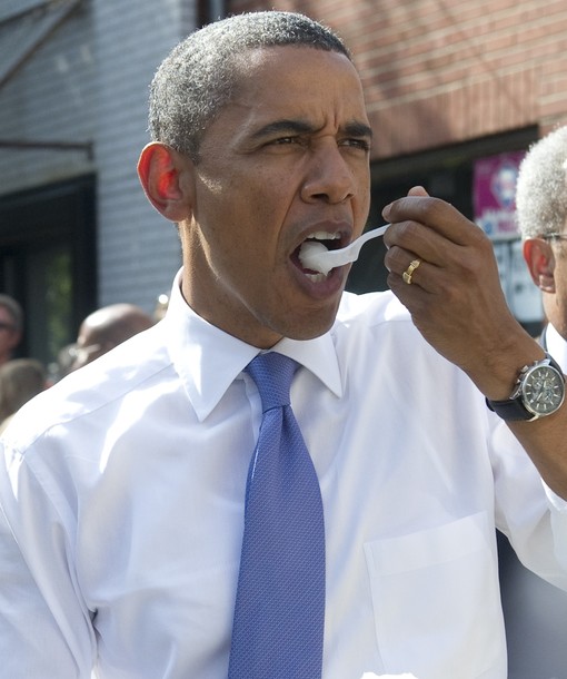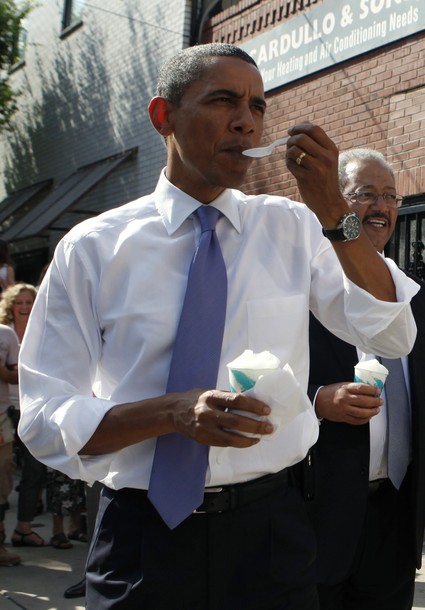 President Barack Obama eats mint chocolate chip ice cream at Brusters Ice Cream shop in Panama City Beach, Florida, August 15