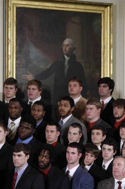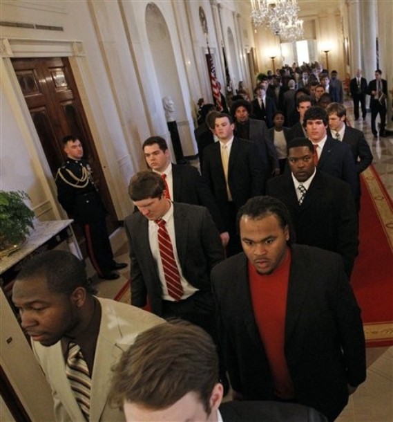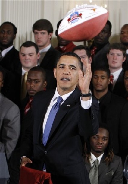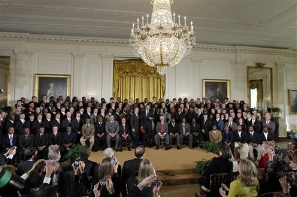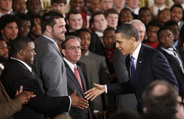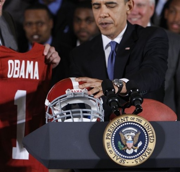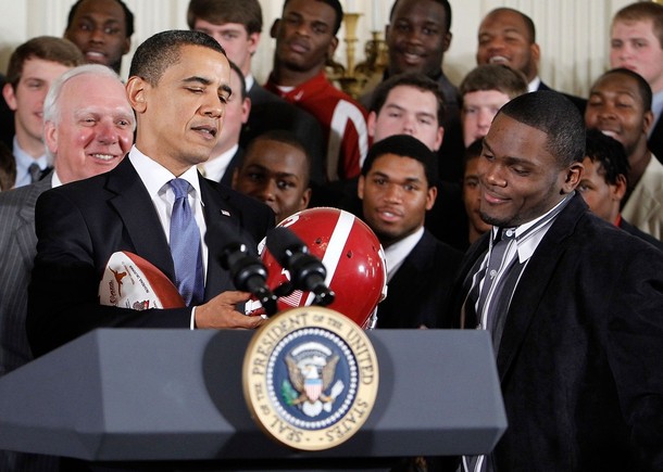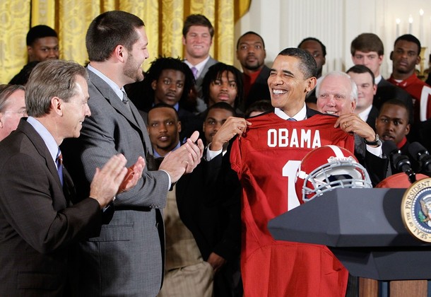 President Barack Obama with BCS champions Crimson Tide in the East Room of the White House in Washington, Monday, March 8, 2025