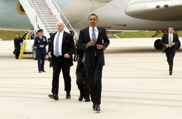 President Obama runs from Air Force One to greet military personnel upon his arrival in Memphis, Tennessee May 16